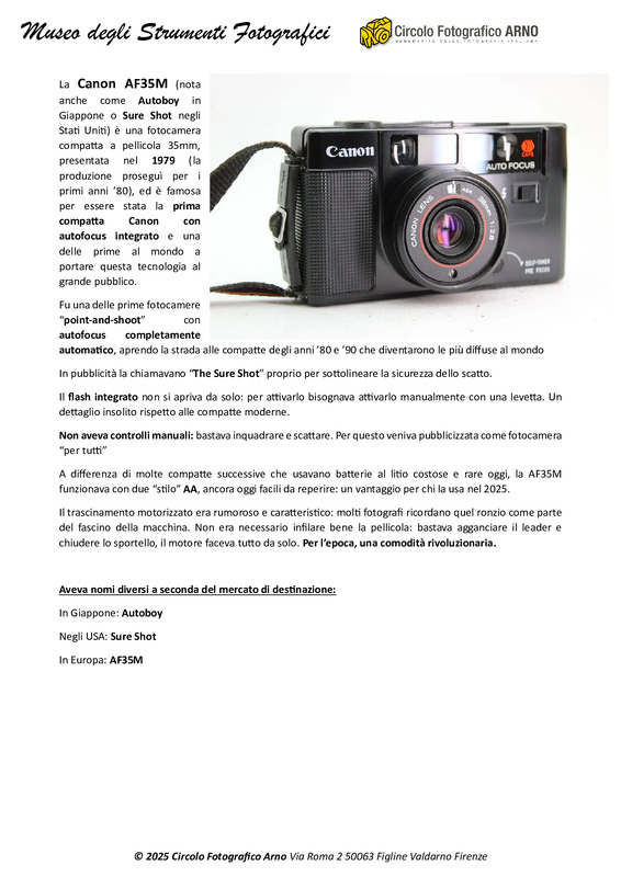 La Canon AF35M (nota anche come Autoboy in Giappone o Sure Shot negli Stati Uniti) è una fotocamera compatta a pellicola 35mm, presentata nel 1979 (la produzione proseguì per i primi anni ’80), ed è famosa per essere stata la prima compatta Canon con autofocus integrato e una delle prime al mondo a portare questa tecnologia al grande pubblico.