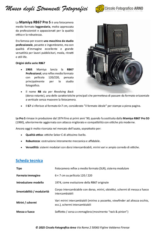 La Mamiya RB67 Pro S è una fotocamera medio formato leggendaria, molto apprezzata da professionisti e appassionati per la qualità ottica e la robustezza.