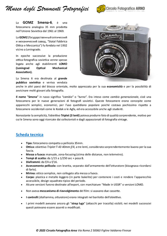 La GOMZ Smena-6, è una fotocamera analogica 35 mm prodotta nell’Unione Sovietica dal 1961 al 1969.