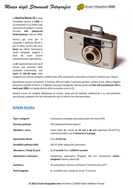 La Konica Revio Z2 è stata introdotta intorno al 1999, in un momento in cui molte case cercavano di spingere il nuovo formato APS (Advanced Photo System), nato nel 1996.