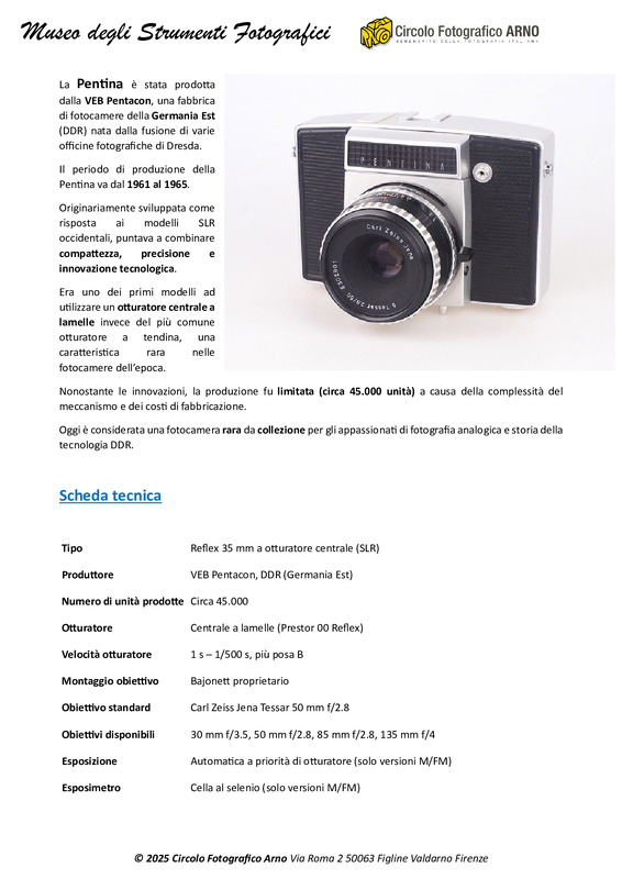La Pentina è stata prodotta dalla VEB Pentacon, una fabbrica di fotocamere della Germania Est (DDR) nata dalla fusione di varie officine fotografiche di Dresda.