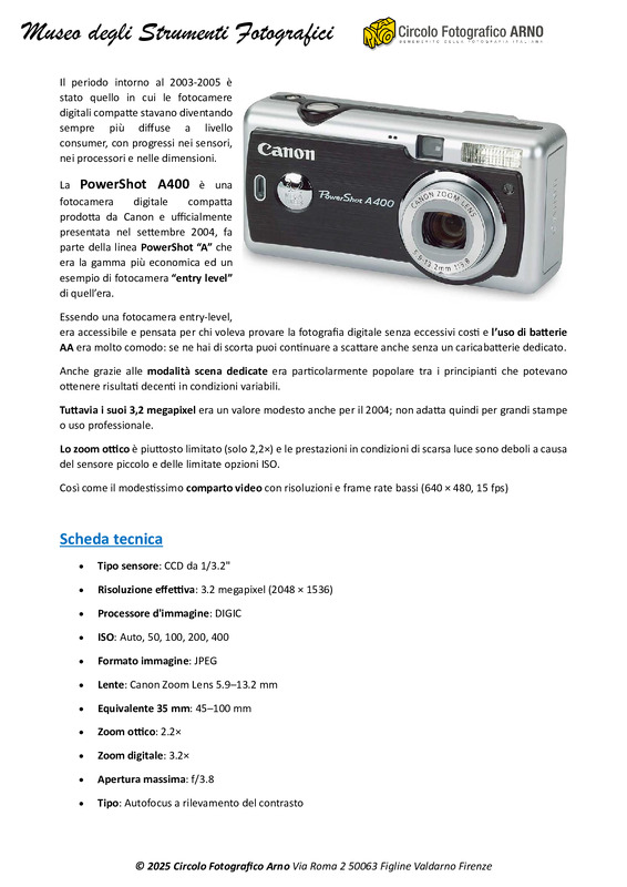 La PowerShot A400 è una fotocamera digitale compatta prodotta da Canon e ufficialmente presentata nel settembre 2004, fa parte della linea PowerShot “A” che era la gamma più economica ed un esempio di fotocamera “entry level” di quell’era.