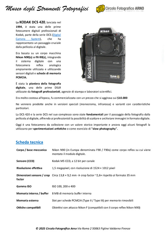 La KODAK DCS 420, lanciata nel 1994, è stata una delle prime fotocamere digitali professionali di Kodak, parte della serie DCS (Digital Camera System), che ha rappresentato un passaggio cruciale dalla pellicola al digitale.