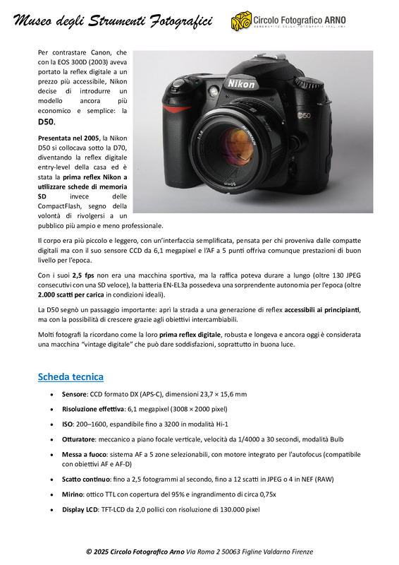 Presentata nel 2005, la Nikon D50 si collocava sotto la D70, diventando la reflex digitale entry-level della casa ed è stata la prima reflex Nikon a utilizzare schede di memoria SD invece delle CompactFlash, segno della volontà di rivolgersi a un pubblico più ampio e meno professionale.