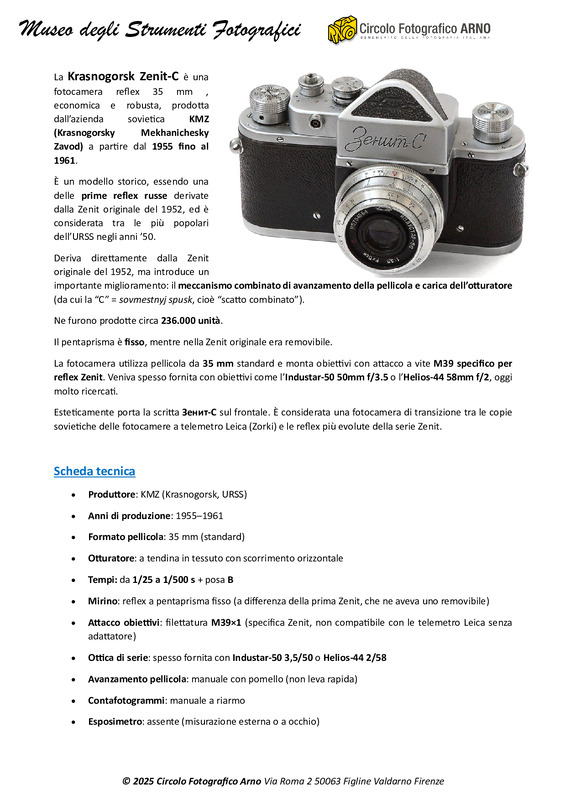 La Krasnogorsk Zenit-C è una fotocamera reflex 35 mm , economica e robusta, prodotta dall’azienda sovietica KMZ (Krasnogorsky Mekhanichesky Zavod) a partire dal 1955 fino al 1961.