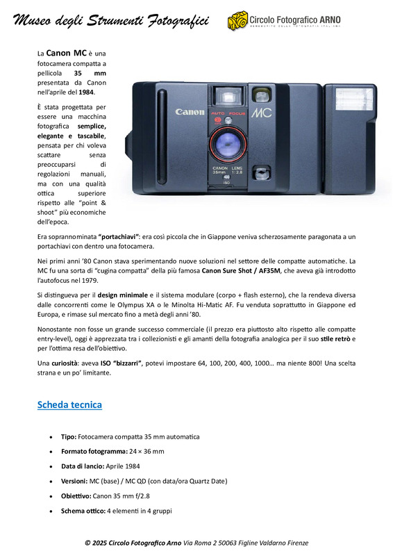 La Canon MC è una fotocamera compatta a pellicola 35 mm presentata da Canon nell’aprile del 1984.