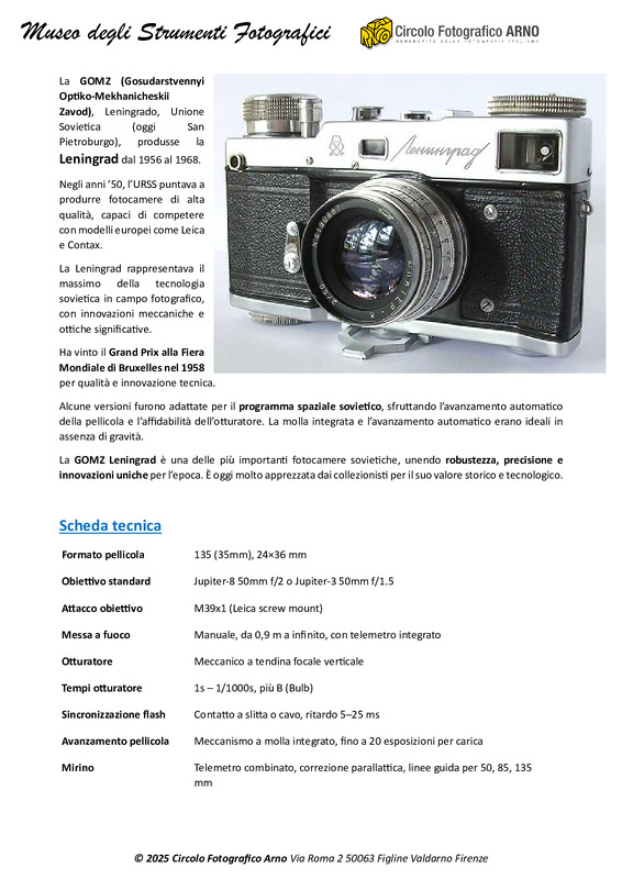 La GOMZ (Gosudarstvennyi Optiko-Mekhanicheskii Zavod), Leningrado, Unione Sovietica (oggi San Pietroburgo), produsse la Leningrad dal 1956 al 1968.