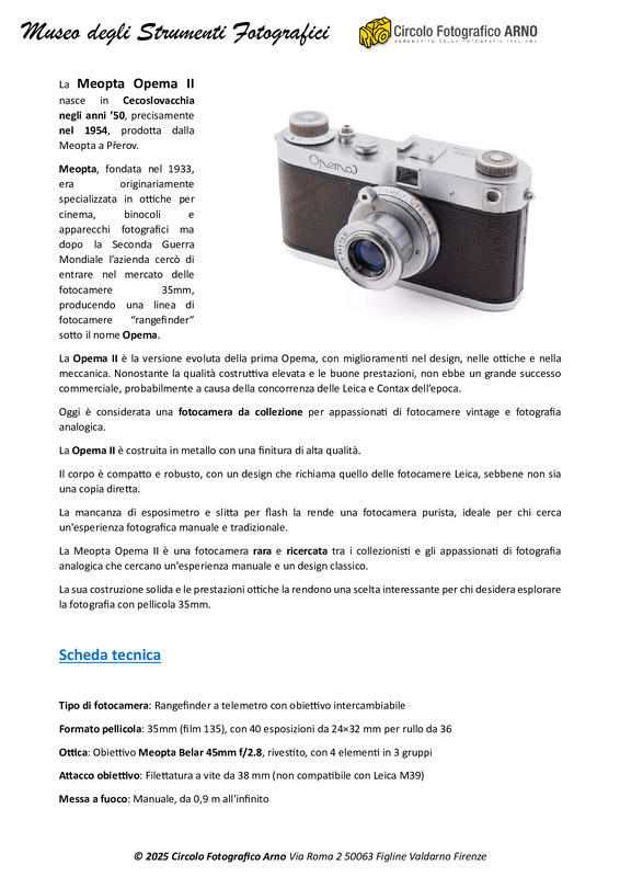 Meopta, fondata nel 1933, era originariamente specializzata in ottiche per cinema, binocoli e apparecchi fotografici ma dopo la Seconda Guerra Mondiale l’azienda cercò di entrare nel mercato delle fotocamere 35mm, producendo una linea di fotocamere “rangefinder” sotto il nome Opema.