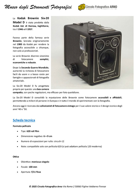 La Kodak Brownie Six-20 Model D è stata prodotta dalla Kodak Ltd. di Harrow, Inghilterra, tra il 1946 e il 1957.