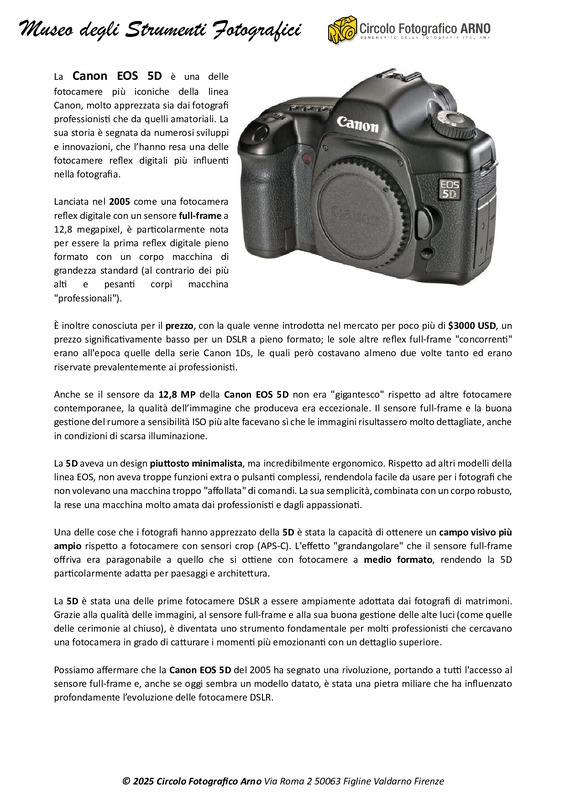 Possiamo affermare che la Canon EOS 5D del 2005 ha segnato una rivoluzione, portando a tutti l'accesso al sensore full-frame e, anche se oggi sembra un modello datato, è stata una pietra miliare che ha influenzato profondamente l’evoluzione delle fotocamere DSLR.
