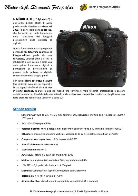 La Nikon D1H (H “high speed”) è una reflex digitale (DSLR) di livello professionale rilasciata da Nikon nel 2001. Fa parte della serie Nikon D1, che ha svolto un ruolo importante nella transizione dei fotografi professionisti dalla pellicola al digitale.